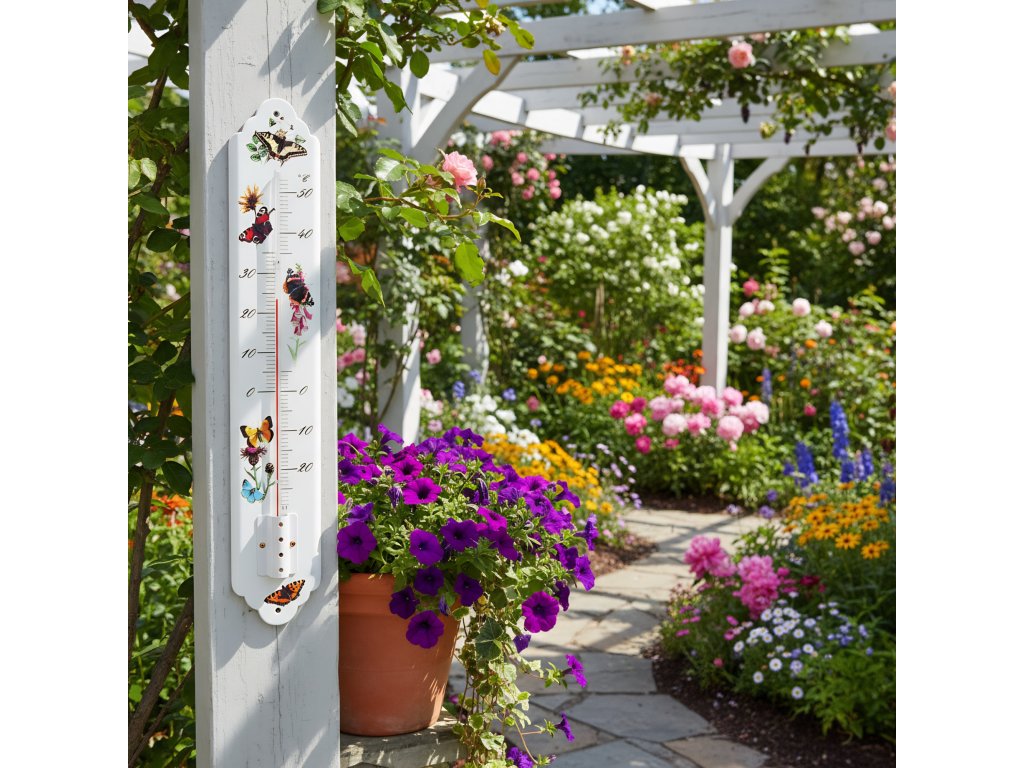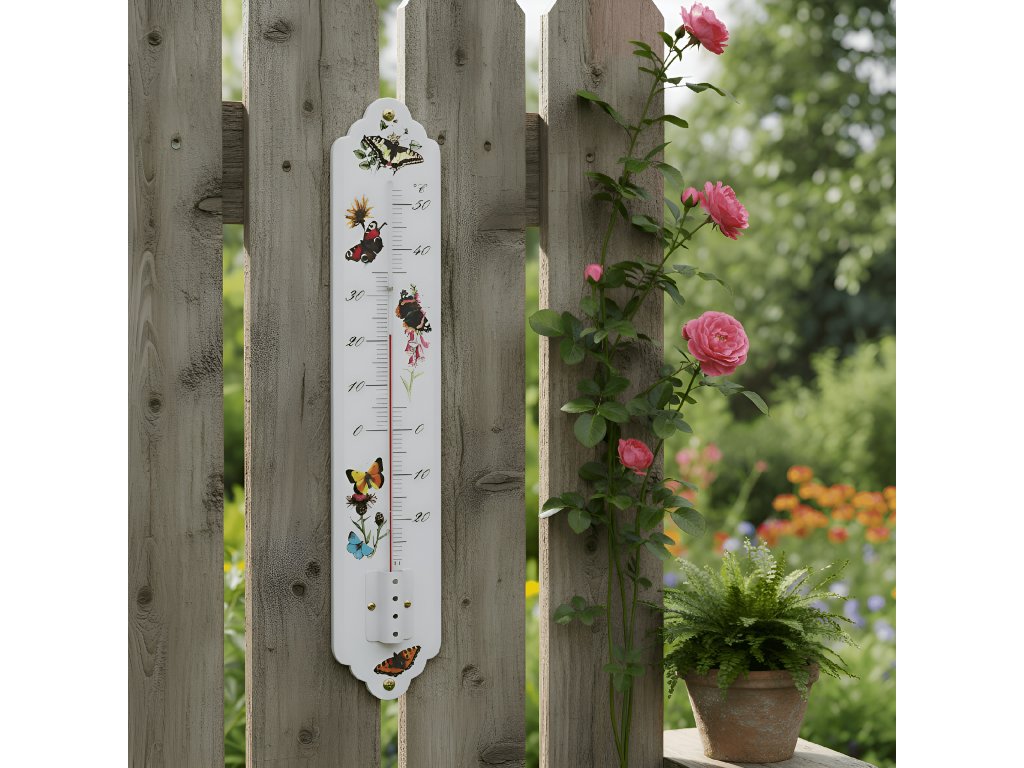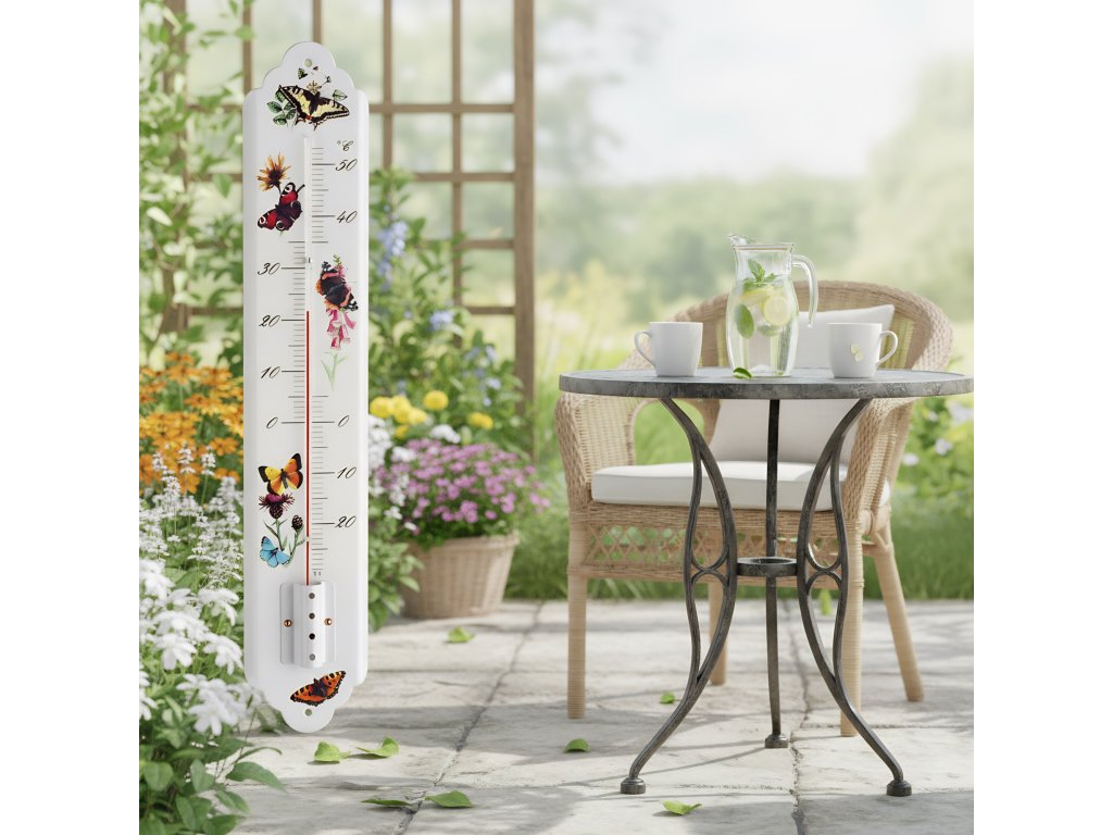 Květinové vzory s motýly vždy okouzlí svým romantickým nádechem. Tento velký kovový teploměr je potištěný barevnými vzory a lze jej používat uvnitř i venku.