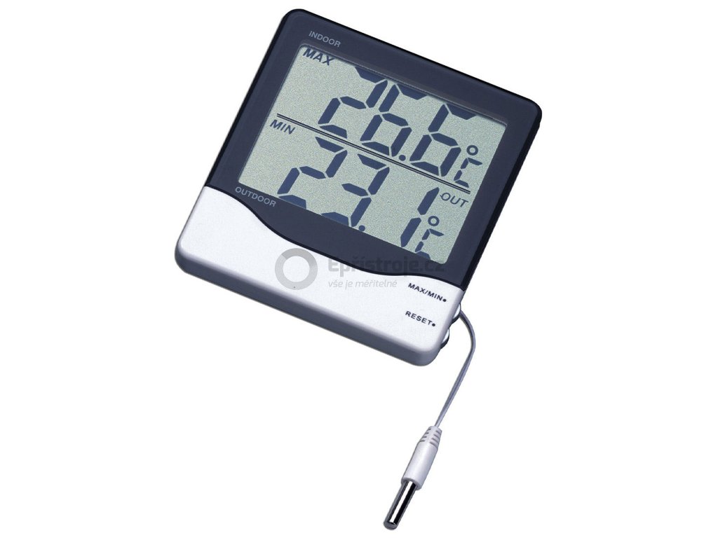 Dvojitý digitální teploměr s drátovým teplotním čidlem (měří vnitřní a venkovní teplotu) a umožňuje sledování MIN. a MAX. teplot.