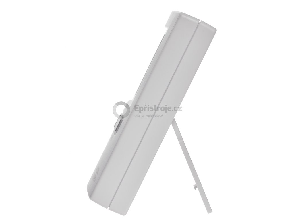 Výklopný stojan a závěsný otvor umožňují flexibilní použití. Teploměr je napájen standardní baterií AAA (součástí balení).