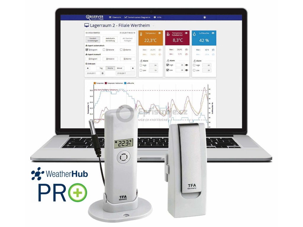 - Startovací sada pro použití webového monitorovacího systému WEATHERHUB OBSERVER, skládající se z profesionálního termo-hygro vysílače s vodotěsným kabelovým senzorem, brány, napájecího adaptéru a LAN kabelu