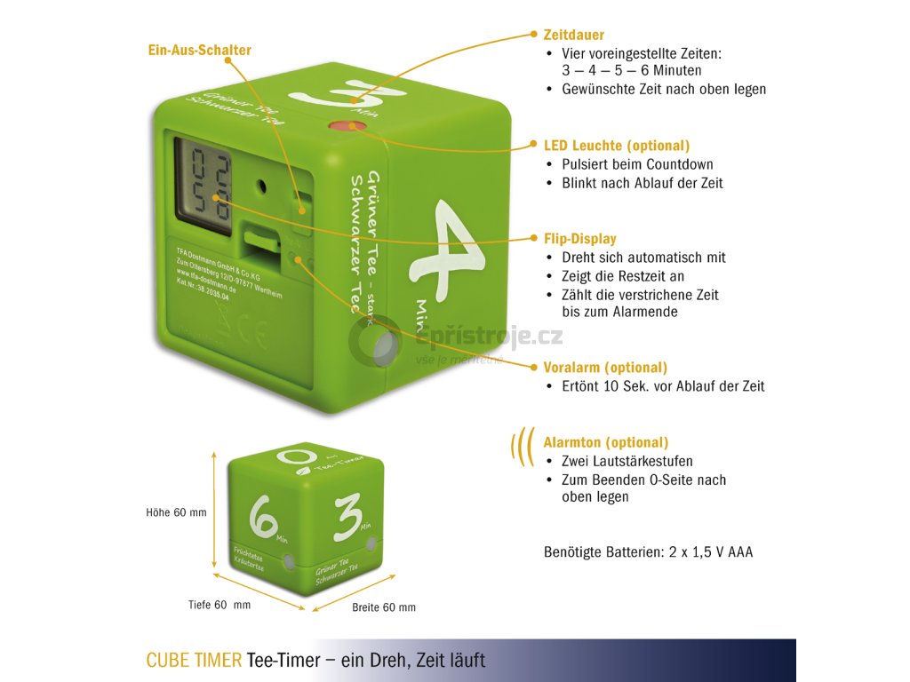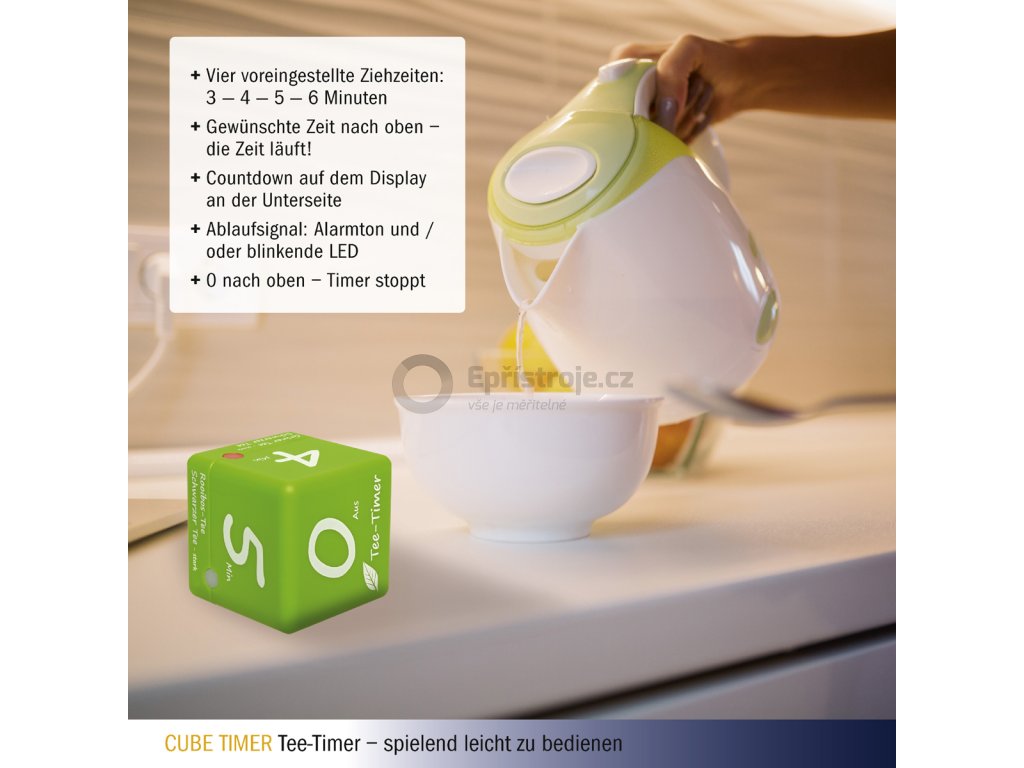 Pokud si chcete uvařit dokonalý šálek čaje, časovač na čaj je ideálním doplňkem do vaší kuchyně i domácnosti. CUBE TIMER je speciálně navržen pro přípravu čaje a jeho použití je velmi snadné. Čaj je po vodě nejoblíbenějším nápojem na světě. Ať už máte rádi zelený čaj, černý čaj, ovocný nebo bylinkový čaj, s čajovým časovačem TFA si můžete připravit lahodný horký nápoj.