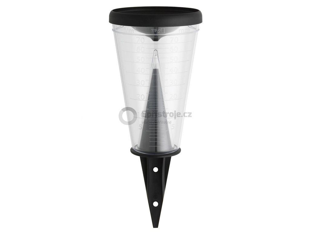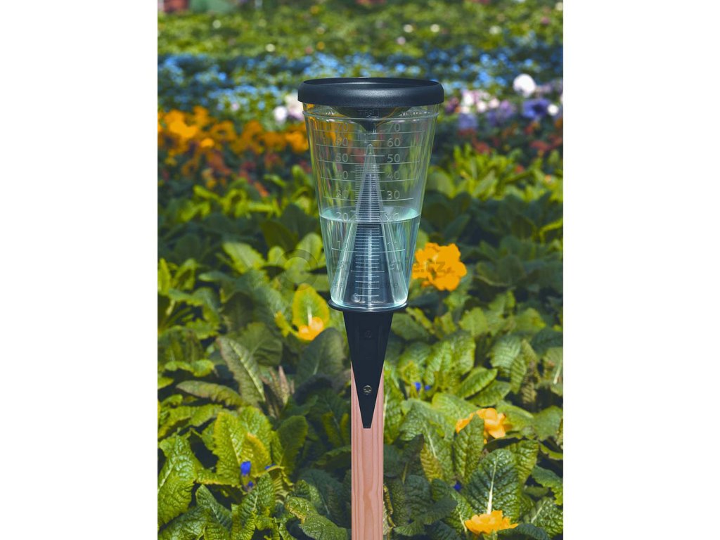 Díky velkému průměru získáte obzvláště přesné údaje a stupnice je snadno čitelná i při malém množství deště. Trychtýřovité víko chrání před odpařováním a umožňuje ještě spolehlivější měření. Praktický držák můžete buď zapíchnout přímo do země, nebo jej připevnit na tyč.
