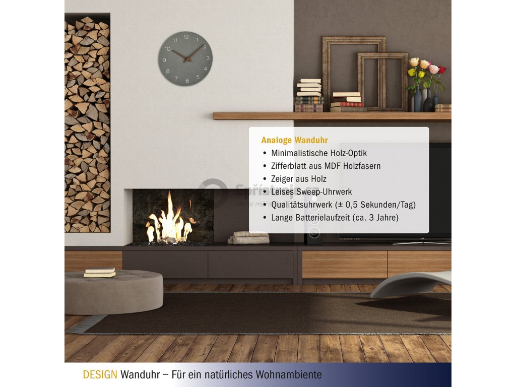 Tyto nástěnné hodiny s minimalistickým dřevěným vzhledem ladí s přírodním obytným prostředím. Unikátní ručičky z ořechového dřeva a ciferník z MDF v přírodních tónech ladí v harmonii.