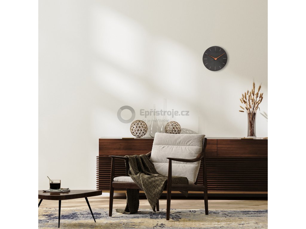 Aby byla zachována přirozený design těchto nástěnných hodin, je na číselníku diskrétně vyryto označení hodin, což podtrhují originální rafičky z ořechového dřeva.