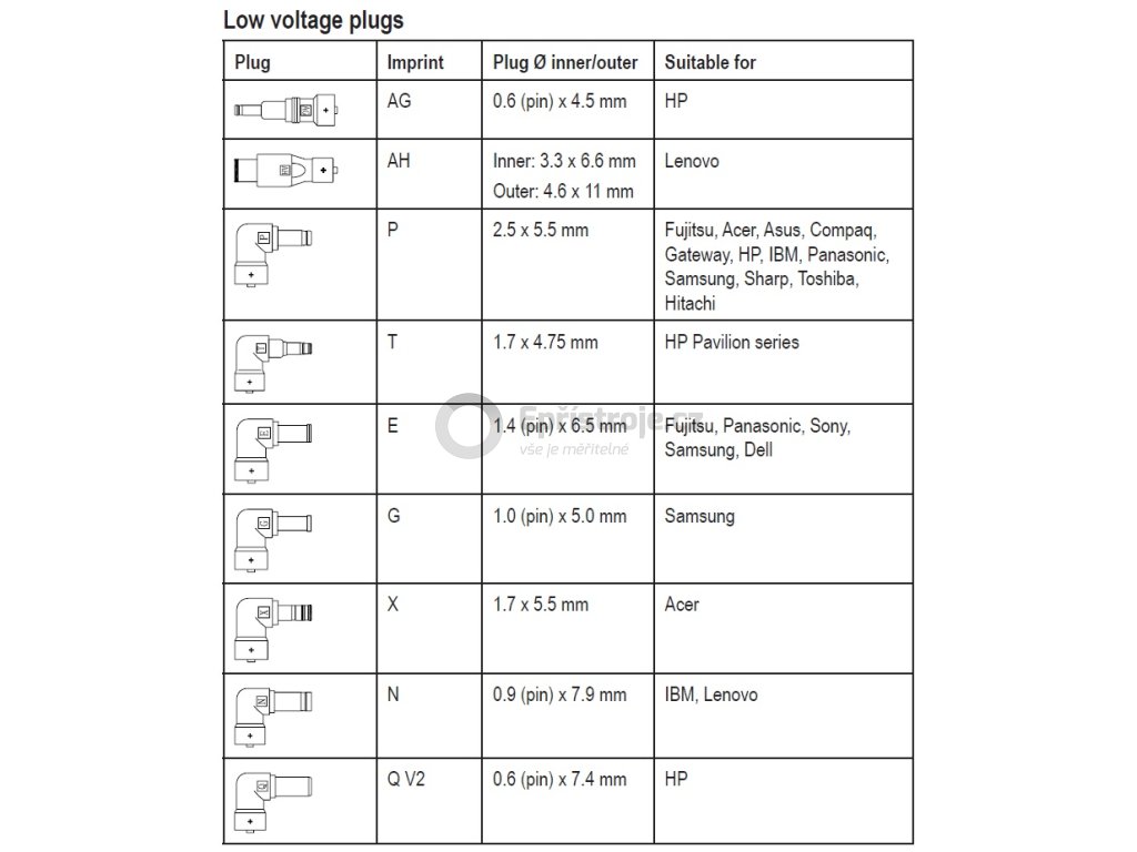 Vyobrazení, rozměry a popis nízkonapěťových konektorů pro připojení notebooků