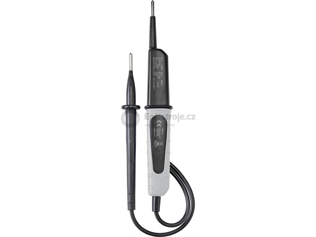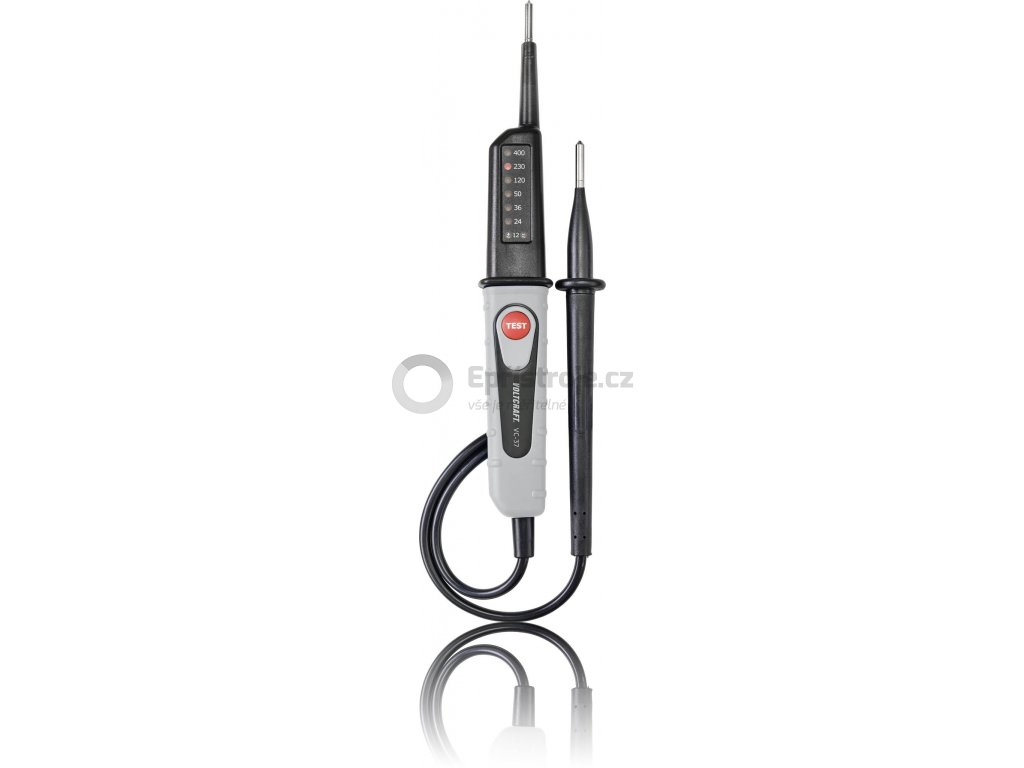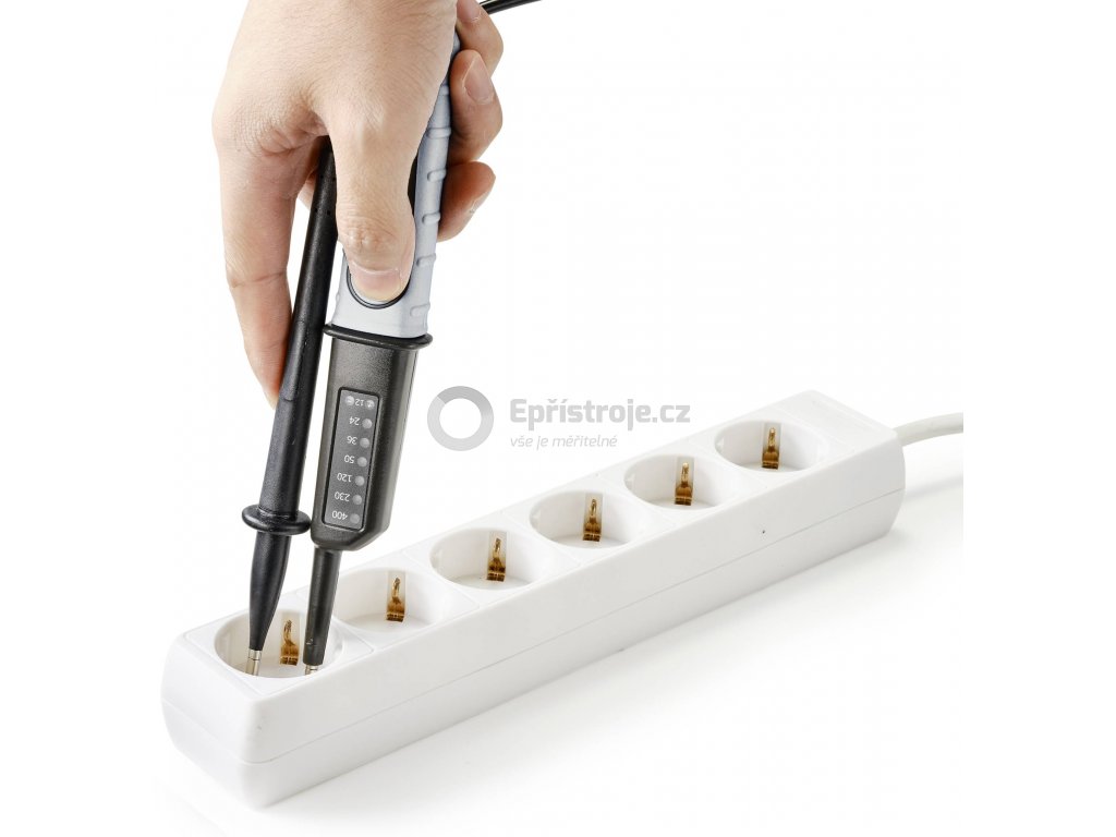 2pólová zkoušečka napětí je přenosné testovací zařízení pro zjišťování a indikaci napěťového stavu nízkonapěťových elektrických obvodů. Slouží k zobrazení/indikaci stejnosměrného a střídavého napětí v rozsahu 12 až 400 V a také polarity při bipolární aplikaci. Rozsahy napětí se zobrazují v 7 úrovních pomocí LED indikace.