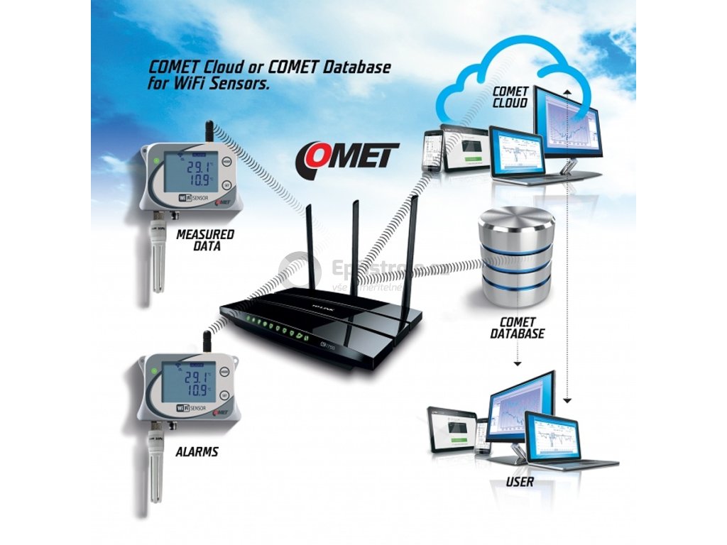 Komunikace se senzorem probíhá prostřednictvím bezdrátové sítě WiFi. Přístroj umožňuje zasílat měřené hodnoty do on-line uložiště COMET Cloud (s nejkratším intervalem 5 minut) nebo do COMET Database. Hodnoty je možné zobrazit na integrovaných www stránkách a poskytovat je do systémů třetí strany pomocí Modbus TCP, SNMP, JSON a XML. Měřené hodnoty jsou zobrazeny na LCD displeji. Uživatelské rozhraní je plně v českém jazyce.