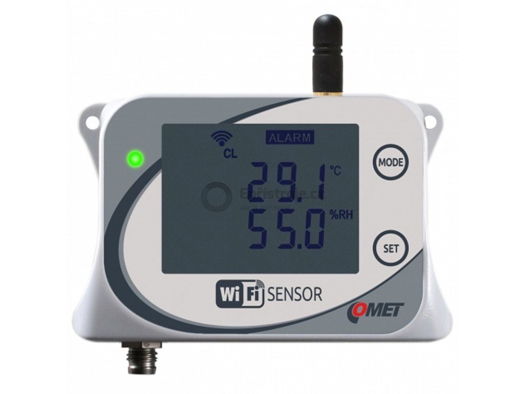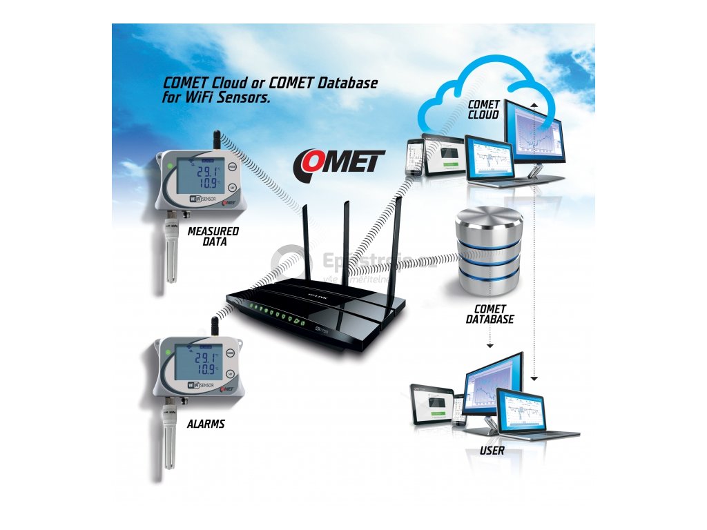 Komunikace se senzorem probíhá prostřednictvím bezdrátové sítě WiFi. Přístroj umožňuje zasílat měřené hodnoty do on-line uložiště COMET Cloud (s nejkratším intervalem 5 minut) nebo do COMET Database. Hodnoty je možné zobrazit na integrovaných www stránkách a poskytovat je do systémů třetí strany pomocí Modbus TCP, SNMP, JSON a XML. Měřené hodnoty jsou zobrazeny na LCD displeji. Uživatelské rozhraní je plně v českém jazyce.