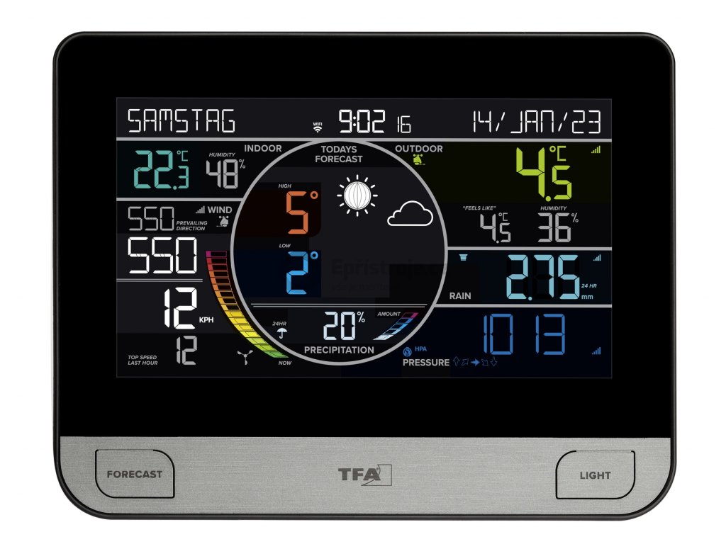 Předpověď na dalších 12 hodin nebo 7 dní můžete také vyvolat jednotlivě stisknutím tlačítka. Objevují se další zajímavé podrobnosti o počasí, jako jsou očekávané maximální a minimální teploty a pravděpodobnost deště. Čas a kalendář se pravidelně aktualizují a můžete dokonce použít aplikaci TFA VIEW k naprogramování osobních zpráv nebo dalších informací o počasí, které se zobrazují na displeji meteostanice.