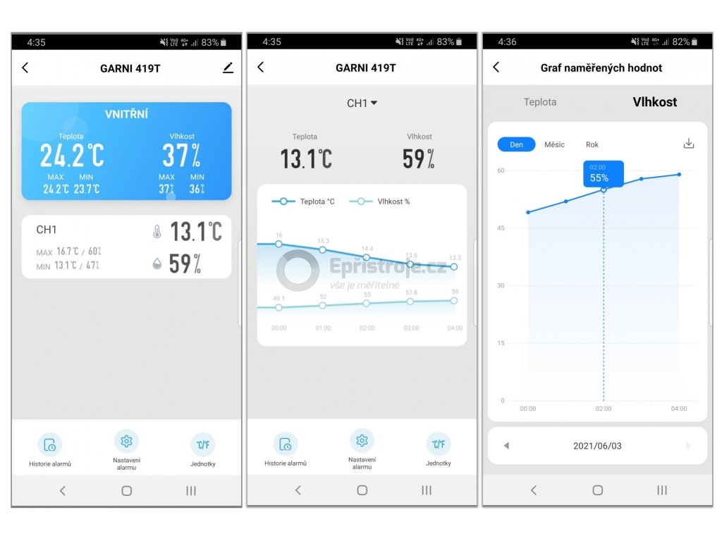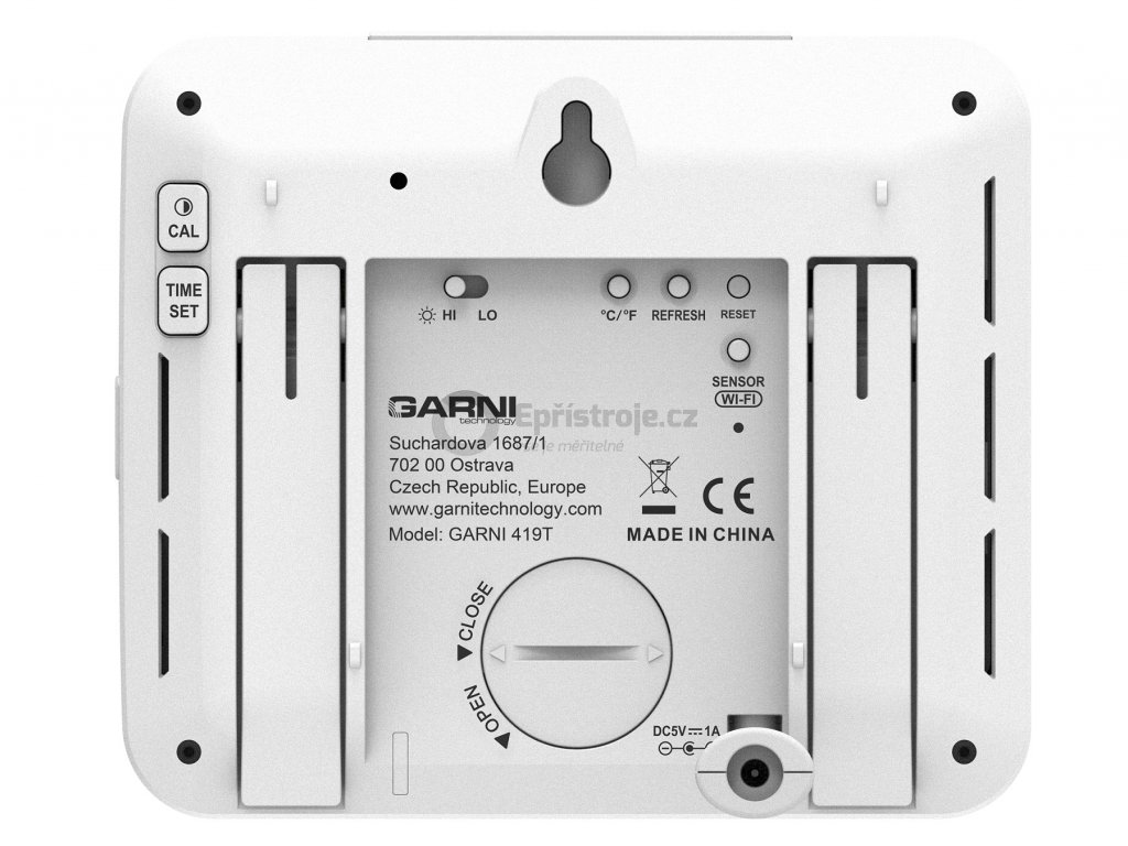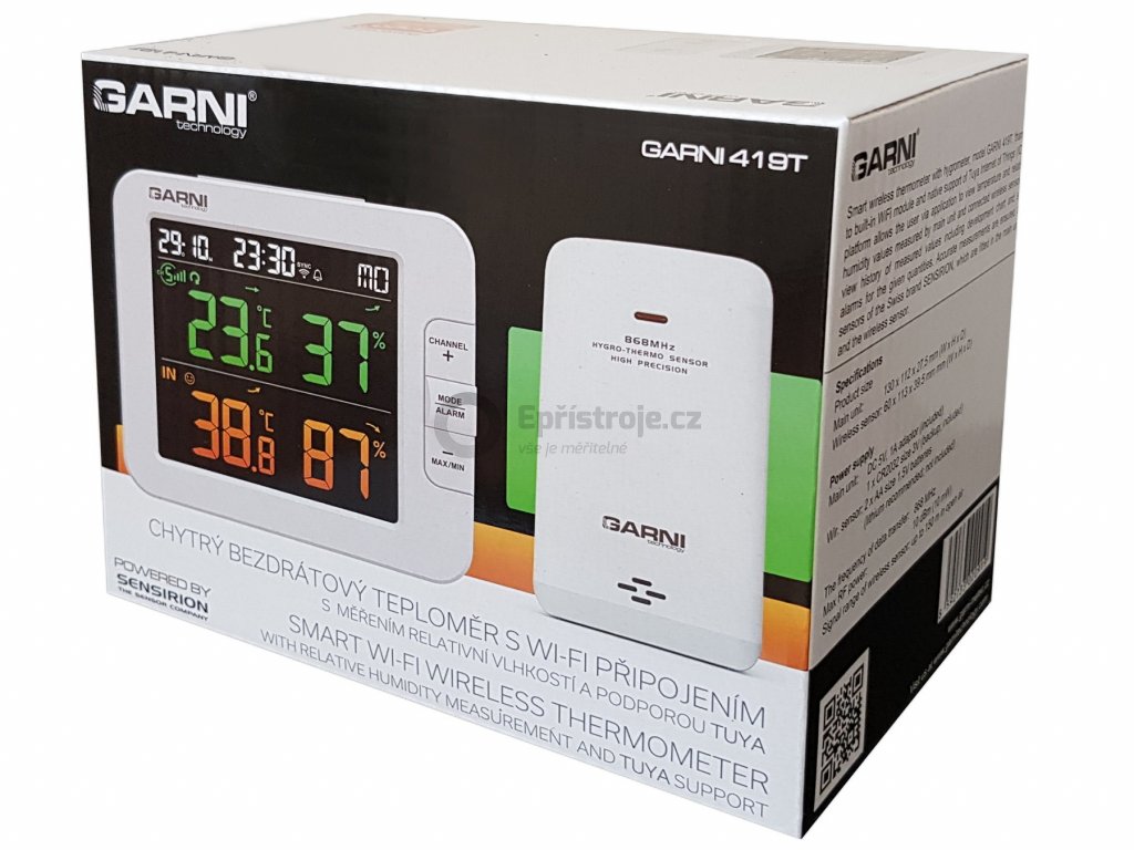 Chytrý vícekanálový teploměr s vlhkoměrem, model GARNI 419T má vestavěný modul WiFi a prostřednictvím svého chytrého systému je kompatibilní s platformou Tuya IOT. Pomocí aplikace Tuya Smart můžete sledovat teplotu a relativní vlhkost hlavní jednotky a bezdrátových čidel, kontrolovat historii záznamů, nastavovat alarmy pro dané veličiny, spouštět pokročilé funkce za pomocí naměřených hodnot a naměřená data odeslat na email v Excel souboru. Je možné jej propojit s dalšími produkty chytré domácnosti, ovládání pak probíhá přes aplikaci v mobilním zařízení. Hlavní jednotka i bezdrátové čidlo jsou osazeny švýcarskými čidly SENSIRION.