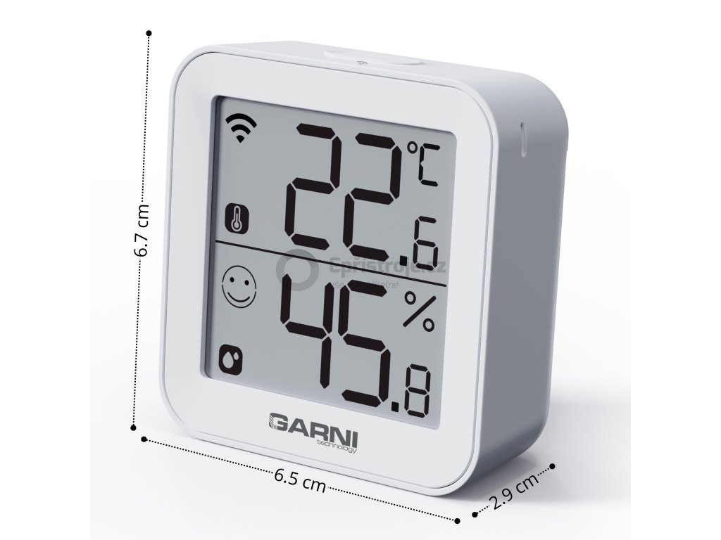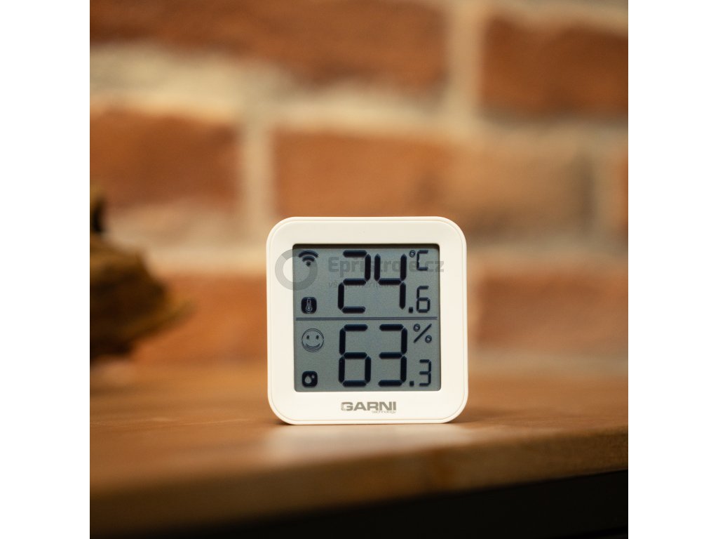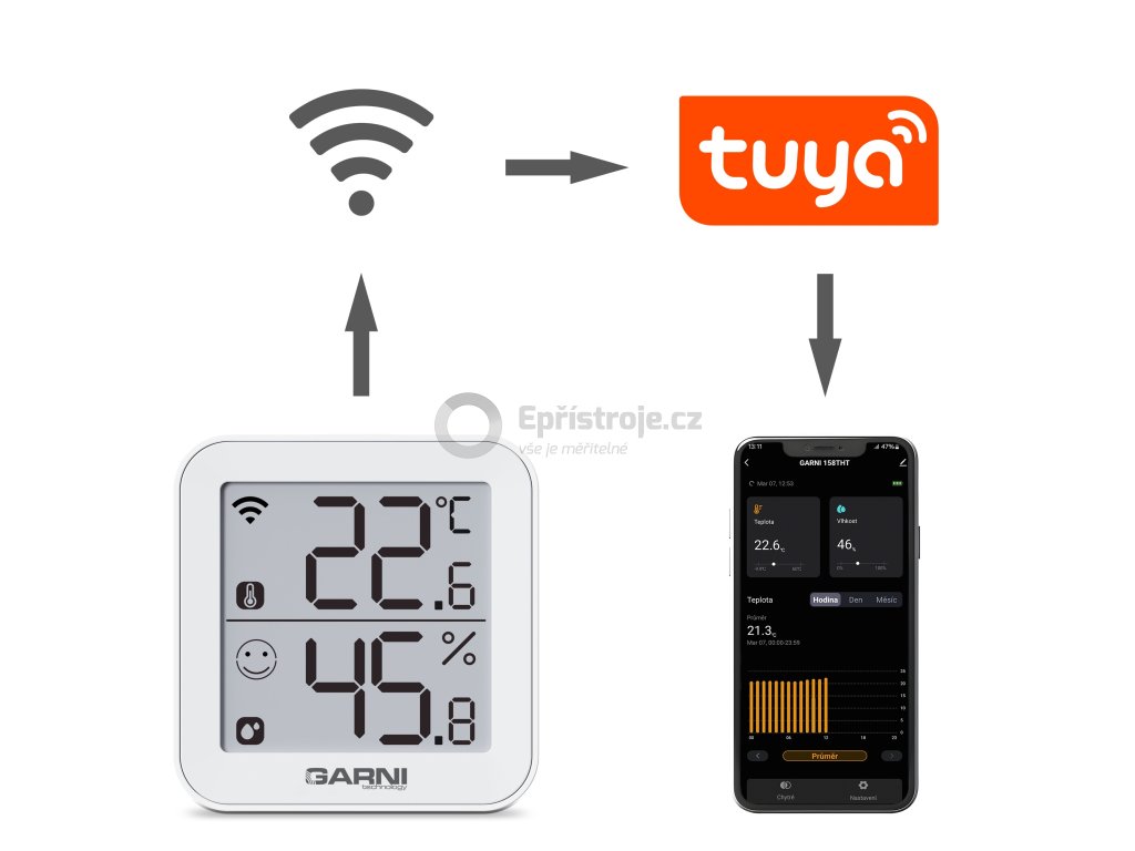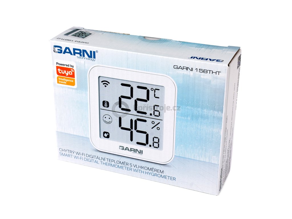 Chytrý vnitřní digitální teploměr s vlhkoměrem model GARNI 158THT má vestavěný modul Wi-Fi a prostřednictvím svého chytrého systému je kompatibilní s platformou Tuya IOT. Pomocí aplikace Tuya Smart můžete sledovat vnitřní teplotu a relativní vlhkost, prohlížet historii záznamů, nastavovat alarmy pro dané veličiny, spouštět pokročilé funkce za pomocí naměřených hodnot a naměřená data odeslat na email v Excel souboru. Je možné jej propojit s dalšími produkty chytré domácnosti, ovládání pak probíhá přes aplikaci v mobilním zařízení. Podporuje integraci do Google Assistant a Alexa.