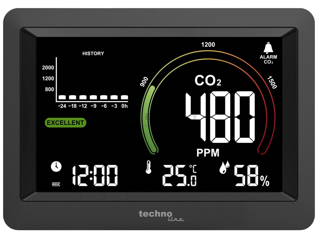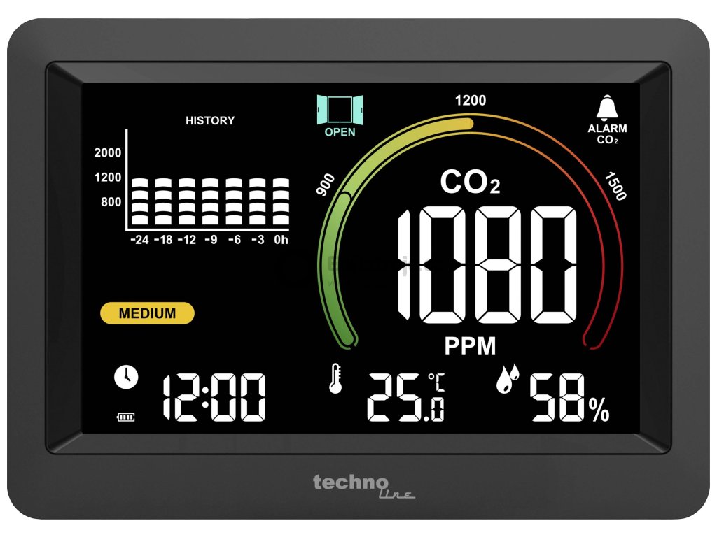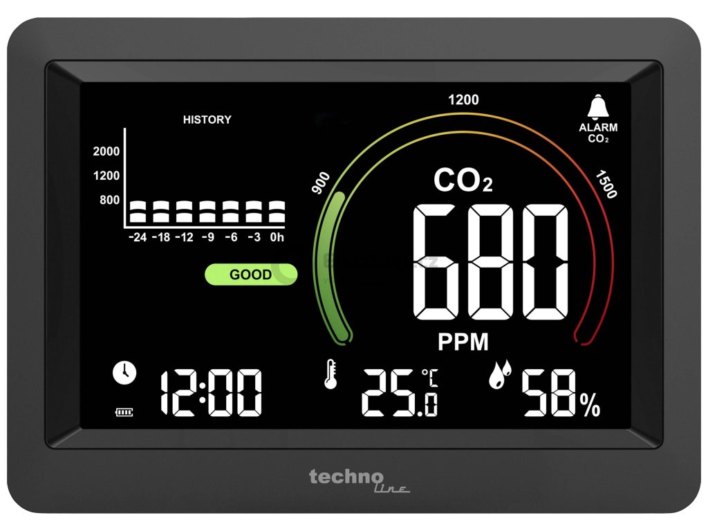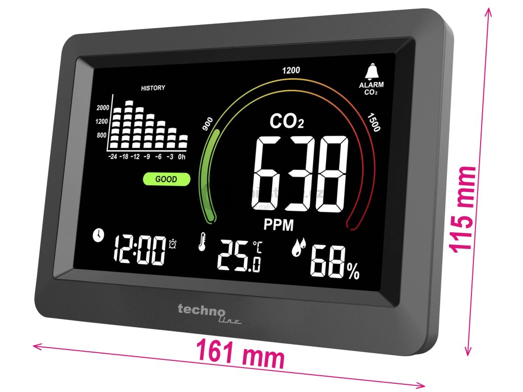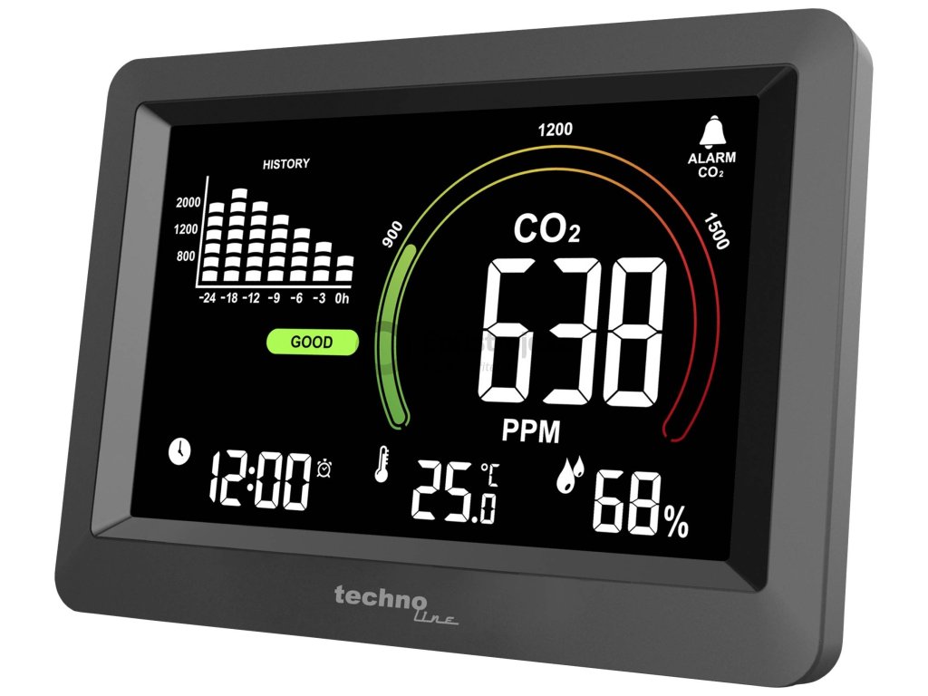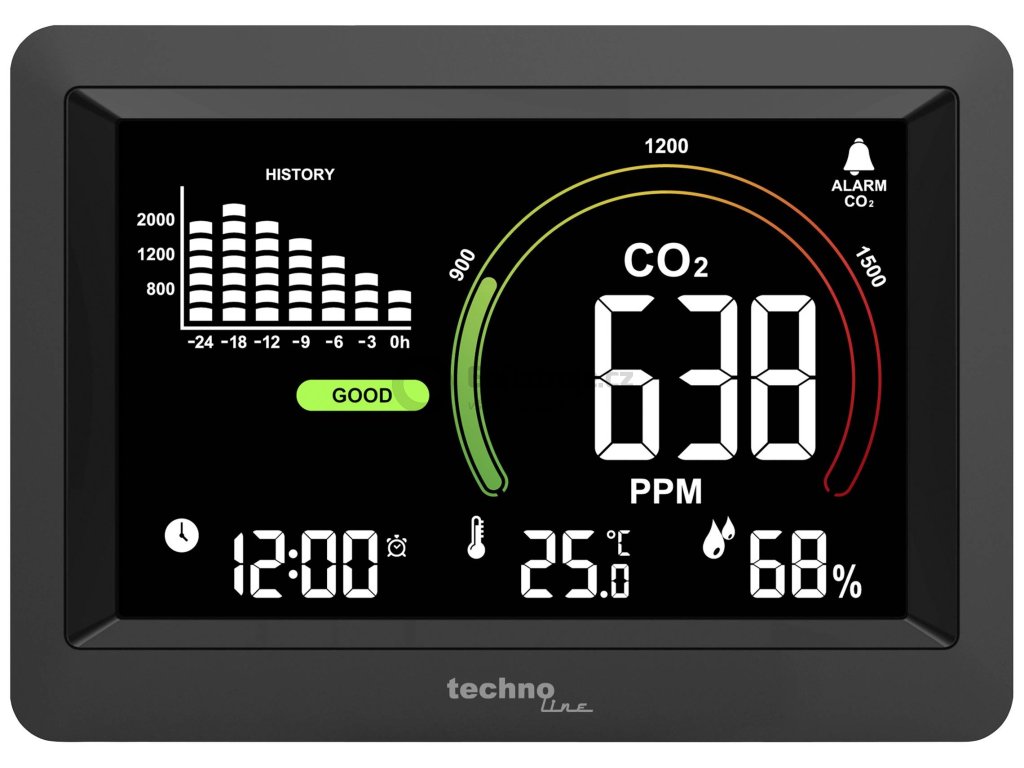 Měřič CO2 (kysličníku uhličitého) Techno Line WL1028W je určen pro vnitřní použití. Měří a zobrazuje na svém barevném inverzním displeji hodnoty CO2 ve vzduchu také teplotu a relativní vlhkost. Pro měření CO2, fotoakustické čidlo ).