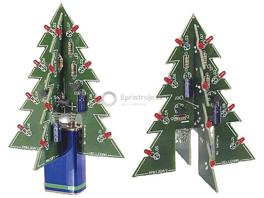 Stavebnice blikajícího vánočního stromečku se vyznačuje minimem součástek a jednoduchou konstrukcí. Navíc díky jednostrannému plošnému spoji je stavebnice vhodná i pro úplné začátečníky elektroniky, kteří se s elektronikou teprve seznamují. Rychlost blikání dána použitými součástkami. Možnost napájení stavebnice z 9V baterie (není součástí balení viz související produkty) dělá celé zařízení plně mobilním a umožňuje jeho instalaci kdekoliv.